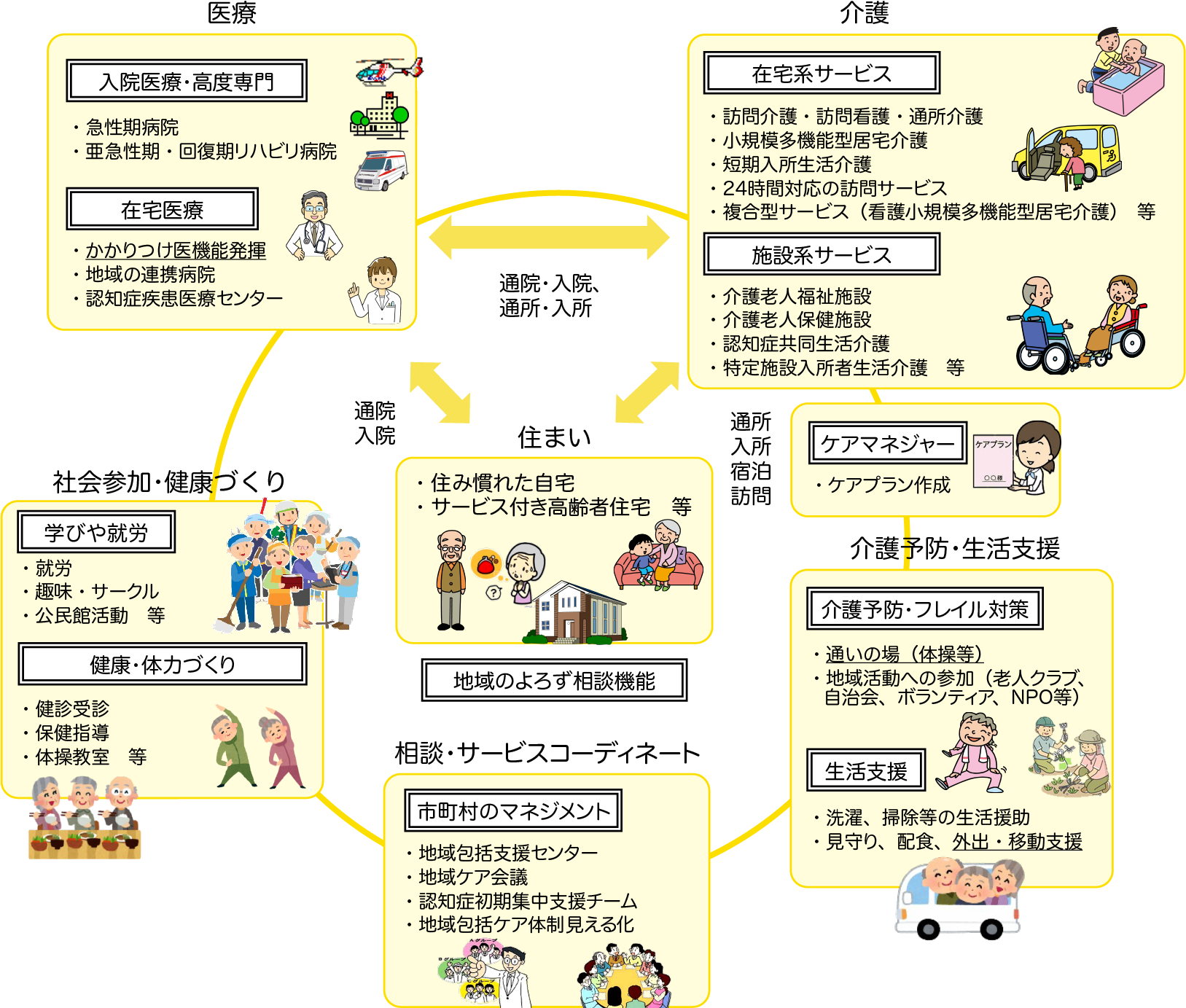 保健・医療・介護(福祉)の多様な主体や地域住民が、地域における自治の力を活かして、自主的・自立的に、また協働して地域課題の解決を図ることにより、「支える側」「支えられる側」という従来の関係を超えて、ともに支え合う地域を目指します。